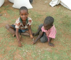 The children sitting near a site of recent food distribution are sorting through the dirt in order to find a few pieces of grain to carry home for the family to eat.
