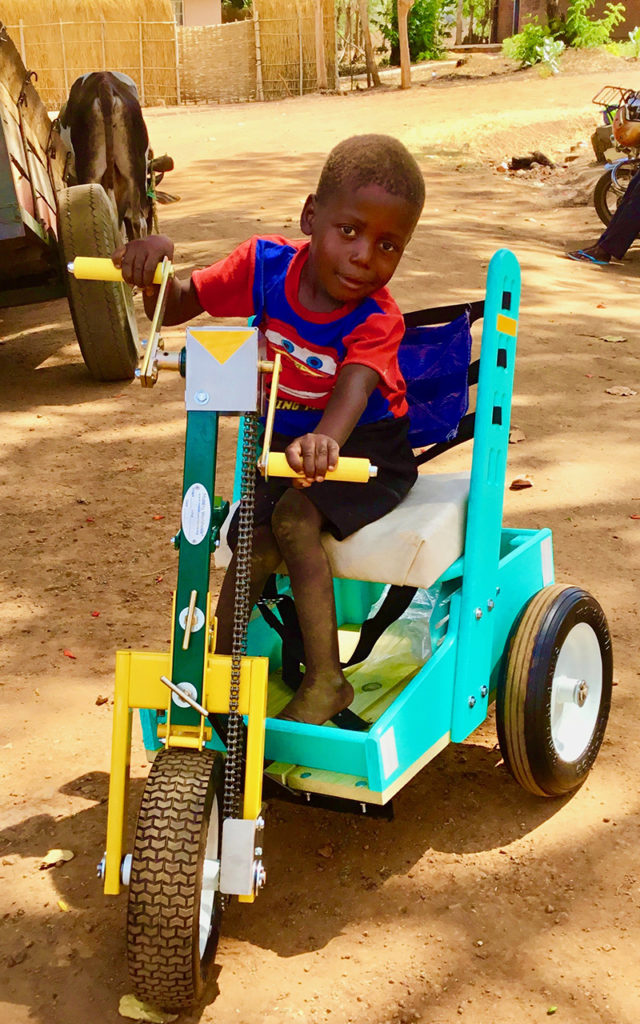 Mzugulira village, Tribal Authority Khombedza, Salima District … The team from Action for Progress arrived at his village, and his mother brought him out on her back. Seven-year-old Smith Kenamau saw the men assembling one of the green and yellow hand-peddled child mobility units, and his eyes never left what they were doing. One could almost sense the need, and the longing, for what was about to happen.