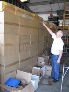 (Pictured are Jerry Winstead and Suzi Stephens RN, Medical Director for the Malawi Project as they look over the boxes of crutches, canes and other mobility supplies collected for Malawi.)