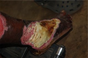 a lot of pain. Samantha puts a few painkillers, disinfectant and bandages in a small back pack, and rushes off to see what she can do to assist this young man. On her arrival Samantha is shocked at what she sees. She is introduced to the young man Ndhala and he tells her his story. He is a fisherman across the bay in Makhanjila and he cut his foot some month’s back. It continued to get worse so he came across the lake by ferry with his wife and young son to get his foot cared for at Salima District hospital since there is no Clinic or Hospital in Makhanjila. He was at the hospital for two months but there was no improvement. It just got worse so he decided to check himself out since there was no Manqwala (medicine) at the hospital. Samantha takes a closer look at his leg. The thoughts raced through her head, "Am I the right person? Where do I start? The pain he must be feeling…. There can be no words that can express it. You can’t leave him like this Sam… First things first, administer pain killers, clean the wound, change the dressing, take him for an x-ray to see if the infection is in the bone, then an HIV test so you know what you are up against, the dead flesh needs to be removed, mmmmm can I do it? You don’t have a lot of choices Sam!" In Part Two of this series we will see if the measures that are taken will save the life of young Ndhala or if his foot and leg will have to be amputated in order for him to survive.