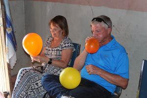 Rae Ann and Jim Messenger can be seen blowing up balloons for the ceremony, as crowds gather to hear local and international speakers.