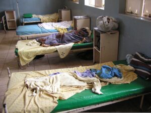 Pictures from top to bottom: Children in a rural school inside a bamboo enclosure, Ward of a small rural hospital, children singing while sitting on the cold, hard floor.